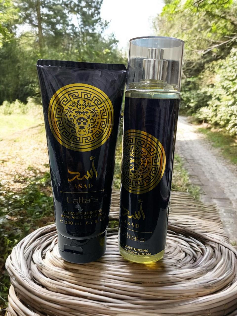 - Crema + Body Splash “Asad” by Lattafa, para hidratar la piel y reforzar el aroma masculino durante todo el día.